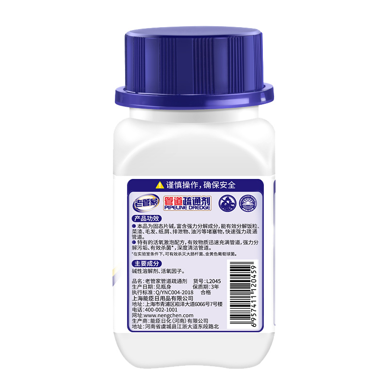 本品为固态片碱,富含强力分解成分,能有效分解饭粒、菜渣、毛发、纸屑、排泄物、油污等堵塞物,快速强力疏通管道。特有的活氧激泡配方,有效物质迅速充满管道,强力分解污垢、有效杀菌,深度清洁管道。